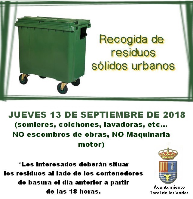 La Mancomunidad de Municipios Bierzo Central procederá a la recogida de residuos sólidos urbanos (somieres, colchones, lavadores, ect ... NO escombros de obras, NO maquinaria de motor) en los núcleos del Municipio de Toral de los Vados el JUEVES 13 DE SEPTIEMBRE DE 2018.