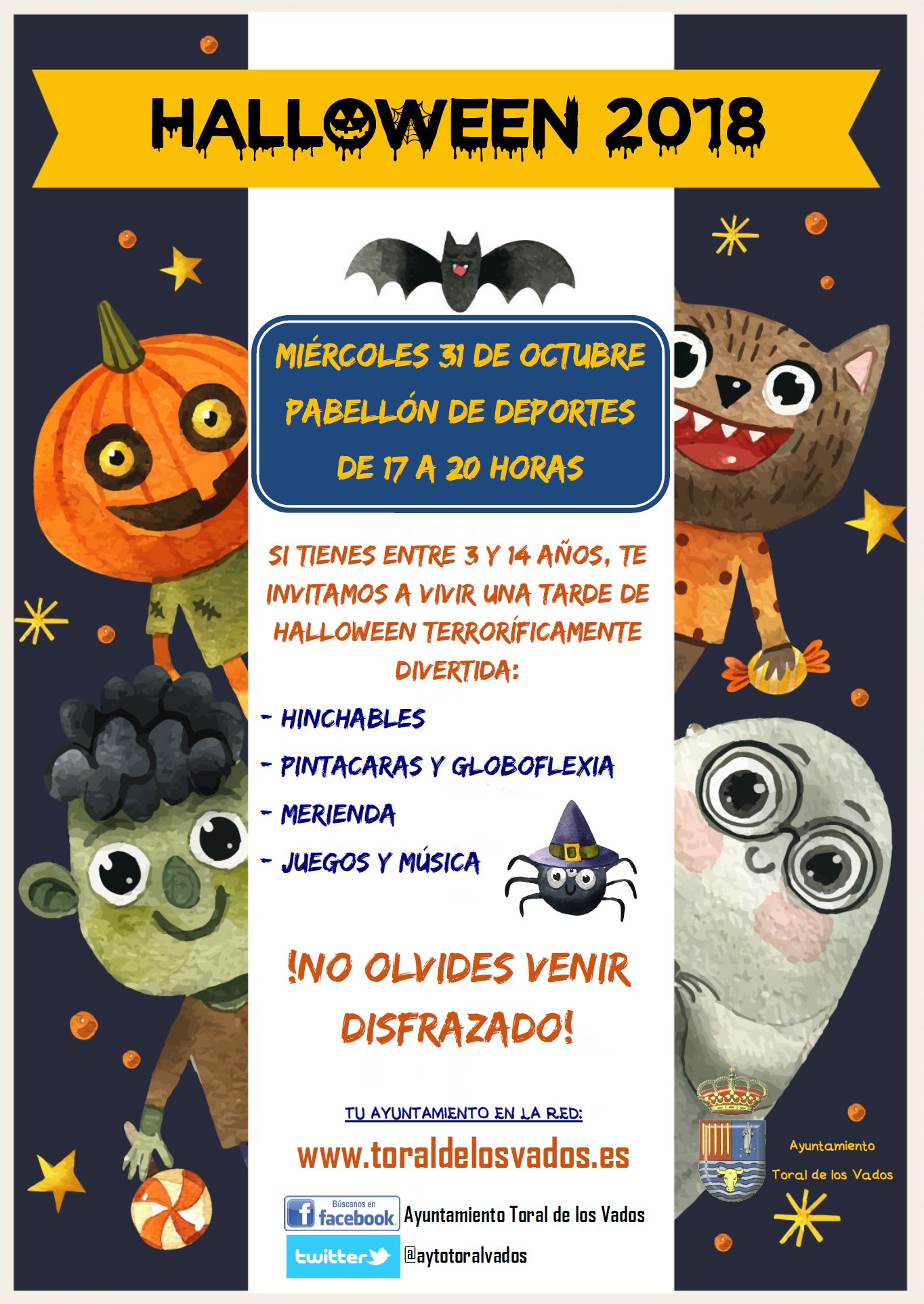 El miércoles 31 de octubre de 2018, en el Pabellón de Deportes de Toral de los Vados (C/ El Lago), de 17 a 20 horas tendrá lugar la fiesta infantil de Halloween 2018.