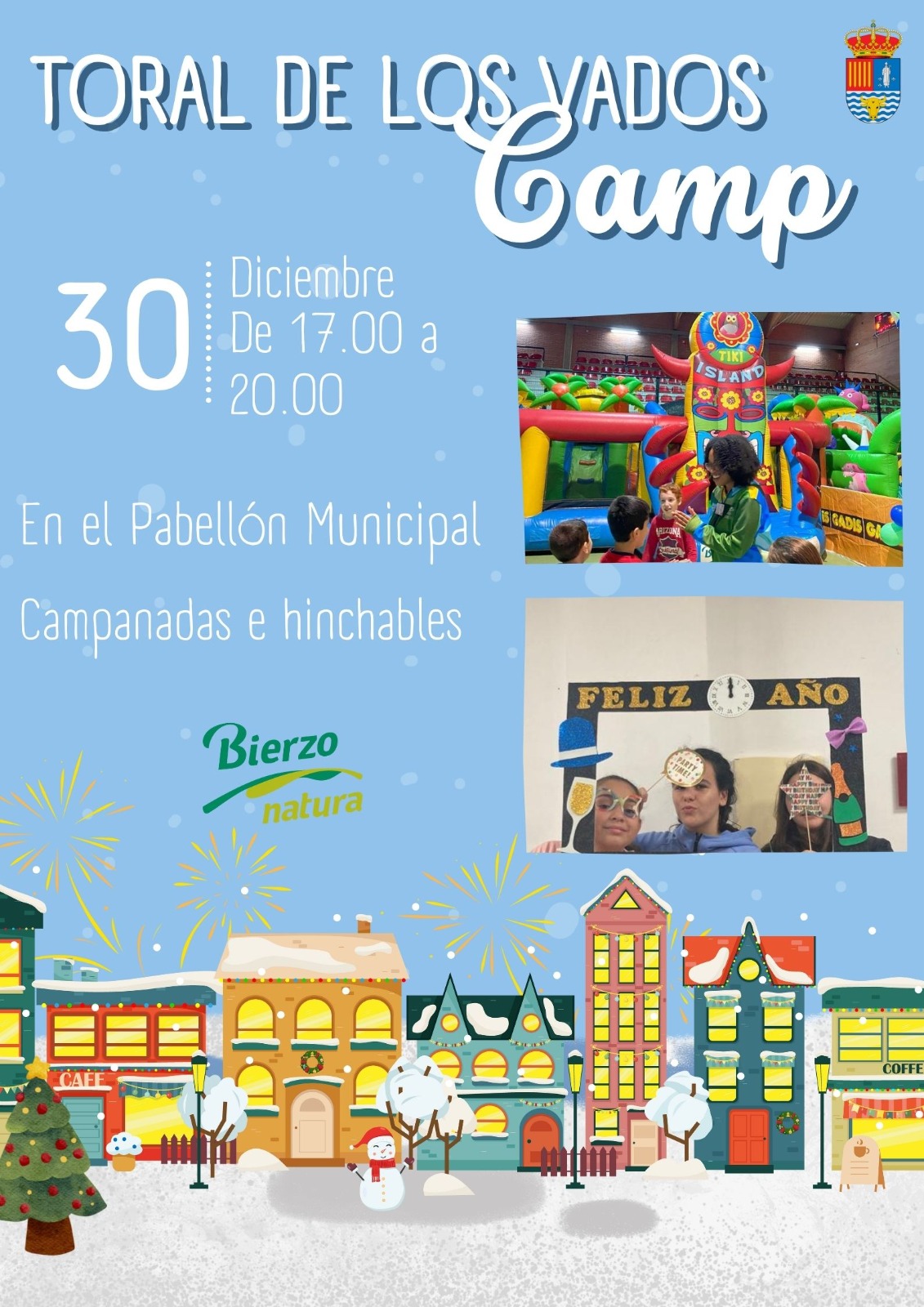 El sábado día 30 de diciembre en el Pabellón Municipal de Deportes de Toral de los Vados, ven a disfrutar de un cotillón infantil con campanadas e hinchables, en horario de 17:00 a 20:00 h.