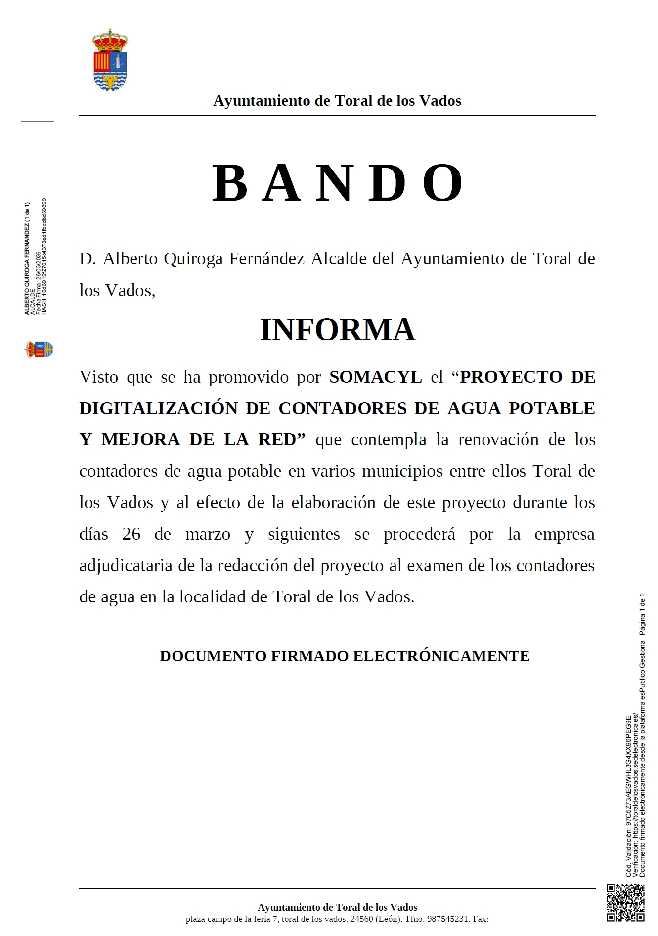 Visto que se ha promovido por SOMACYL el “PROYECTO DE DIGITALIZACIÓN DE CONTADORES DE AGUA POTABLE Y MEJORA DE LA RED” que contempla la renovación de los contadores de agua potable en varios municipios entre ellos Toral de los Vados y al efecto de la elaboración de este proyecto durante los días 26 de marzo y siguientes se procederá por la empresa adjudicataria de la redacción del proyecto al examen de los contadores de agua en la localidad de Toral de los Vados.