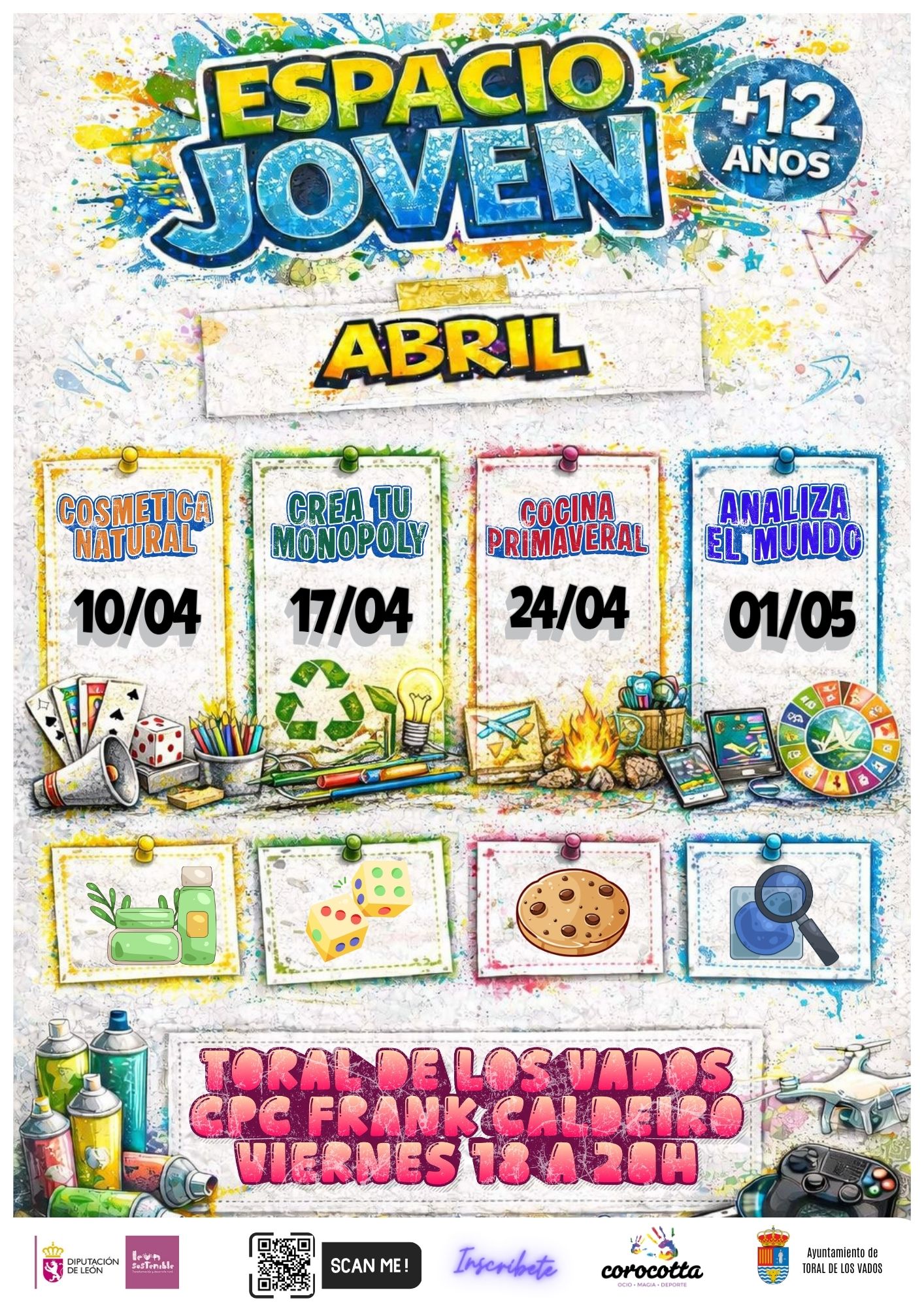 El Espacio Joven de Toral de los Vados presenta su programación de actividades para el mes de abril, con propuestas variadas y dinámicas dirigidas a fomentar la creatividad, el aprendizaje y la participación juvenil. Todas las actividades se desarrollarán en el CPC Frank Caldeiro, los viernes de 18:00 a 20:00 horas.