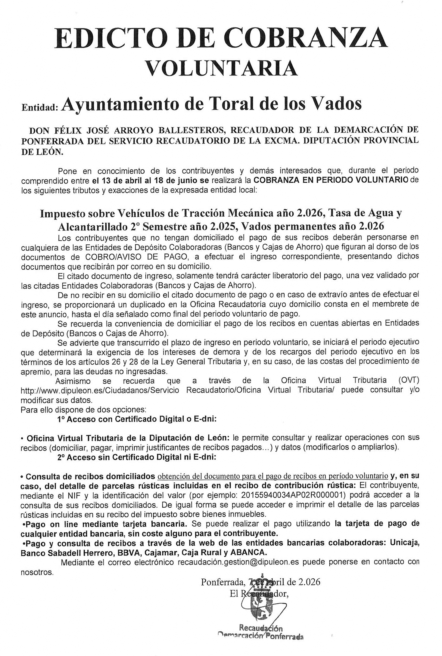El Ayuntamiento de Toral de los Vados informa del inicio del periodo de cobranza en fase voluntaria de diversos tributos municipales, según el edicto emitido por el Servicio Recaudatorio de la Diputación Provincial de León.