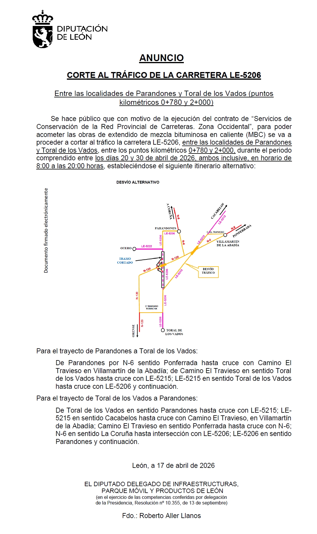 Con motivo de la ejecución del contrato de “Servicios de Conservación de la Red Provincial de Carreteras. Zona Occidental”, para poder acometer las obras de extendido de mezcla bituminosa en caliente (MBC) se va a proceder a cortar al tráfico la carretera LE-5206, entre las localidades de Parandones y Toral de los Vados, entre los puntos kilométricos 0+780 y 2+000, durante el periodo comprendido entre los días 20 y 30 de abril de 2026, ambos inclusive, en horario de 8:00 a las 20:00 horas, estableciéndose el siguiente itinerario alternativo: