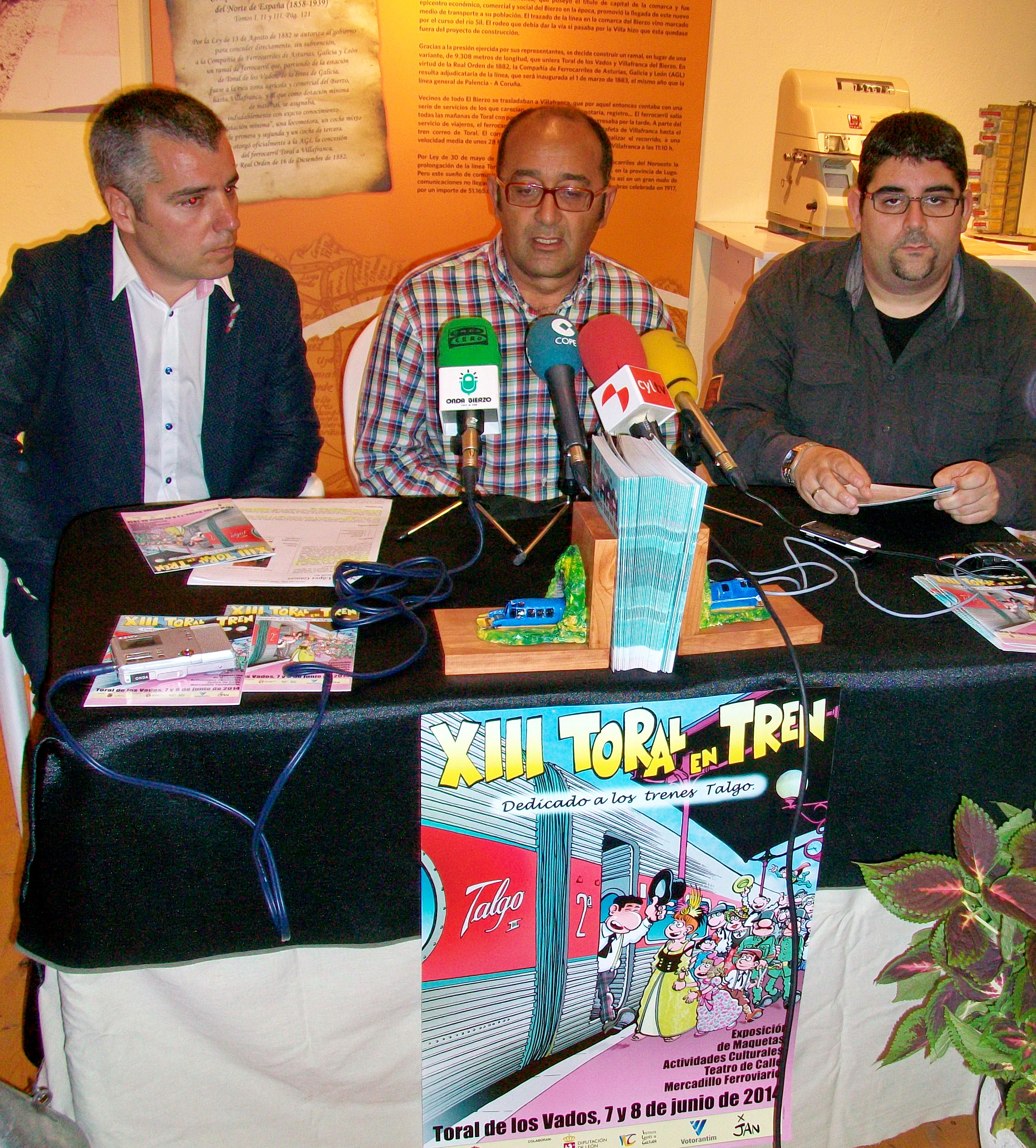 El centro de interpretación del Ferrocarril de Toral de los Vados acogió hoy martes 3 de junio a las 12 horas la presentación oficial a los medios de comunicación de la XIII edición de Toral en tren 2014, que se celebrará los días 7 y 8 de junio. Representantes del Ayuntamiento, acompañados por el Concejal de Cultura del Ayuntamiento de Ponferrada, dieron a conocer el programa de actos que os presentamos a continuación:
