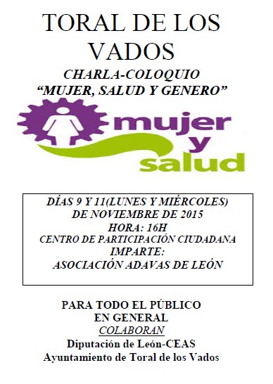 El CEAS y la Diputación de León, en colaboración con el Ayuntamiento de Toral de los Vados, organizan para los próximos días 9 y 11 de noviembre (Lunes y miércoles) unas charlas bajo el título "Mujer, salud y género".