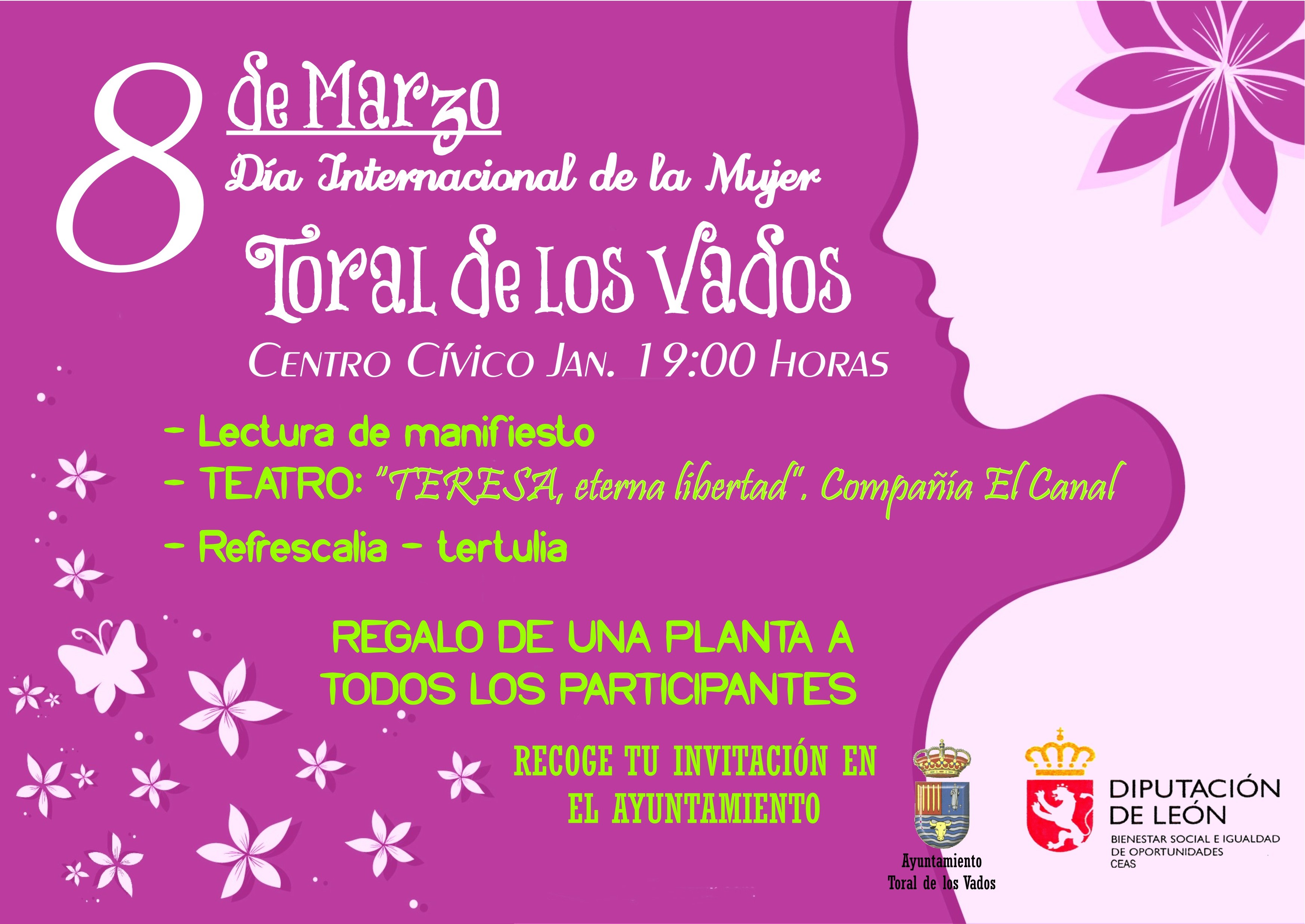 Con motivo de la celebración del día Internacional de la Mujer, el próximo 8 de marzo, La Diputación de León y el CEAS, en colaboración con el Ayuntamiento de Toral de los Vados, han preparado el siguiente programa de actos: