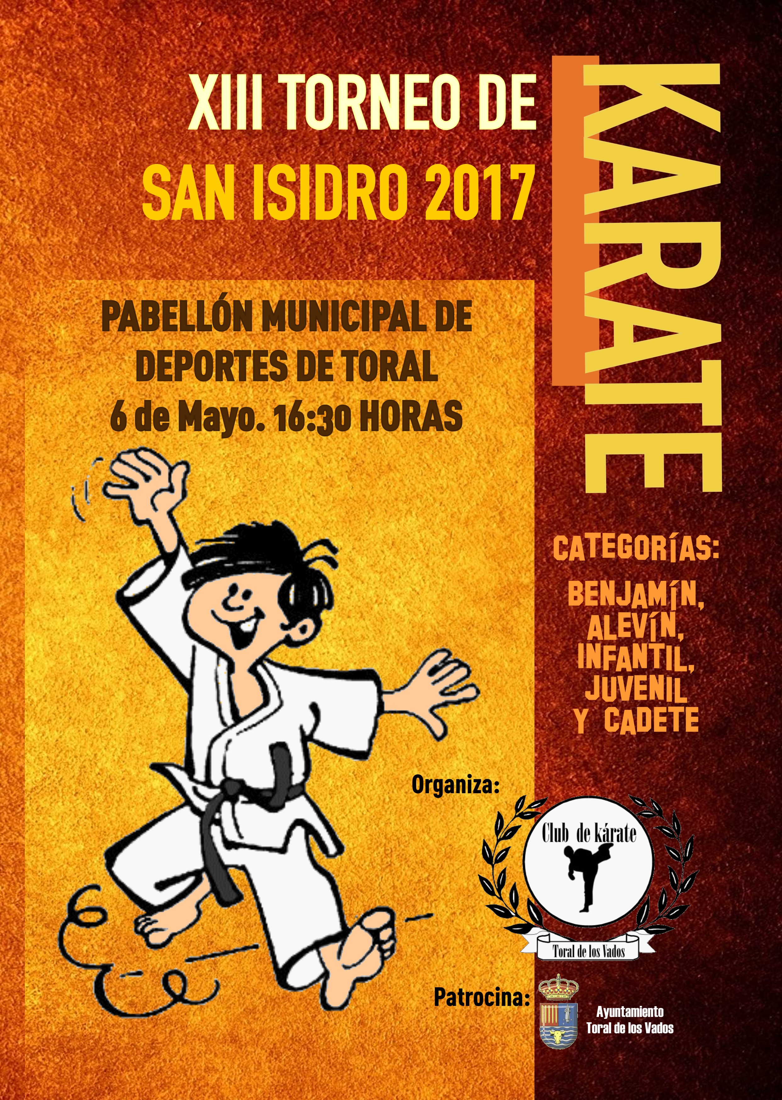 El Club de Kárate de Toral de los Vados, en colaboración con el Ayuntamiento de Toral de los Vados, organiza el XIII Torneo de karate San Isidro, que tendrá lugar el próximo 6 de Mayo en el Pabellón Municipal de Deportes (C/El Lago), a partir de las 16:30 horas, en las categorías de benjamín, alevín, infantil, juvenil y cadete.