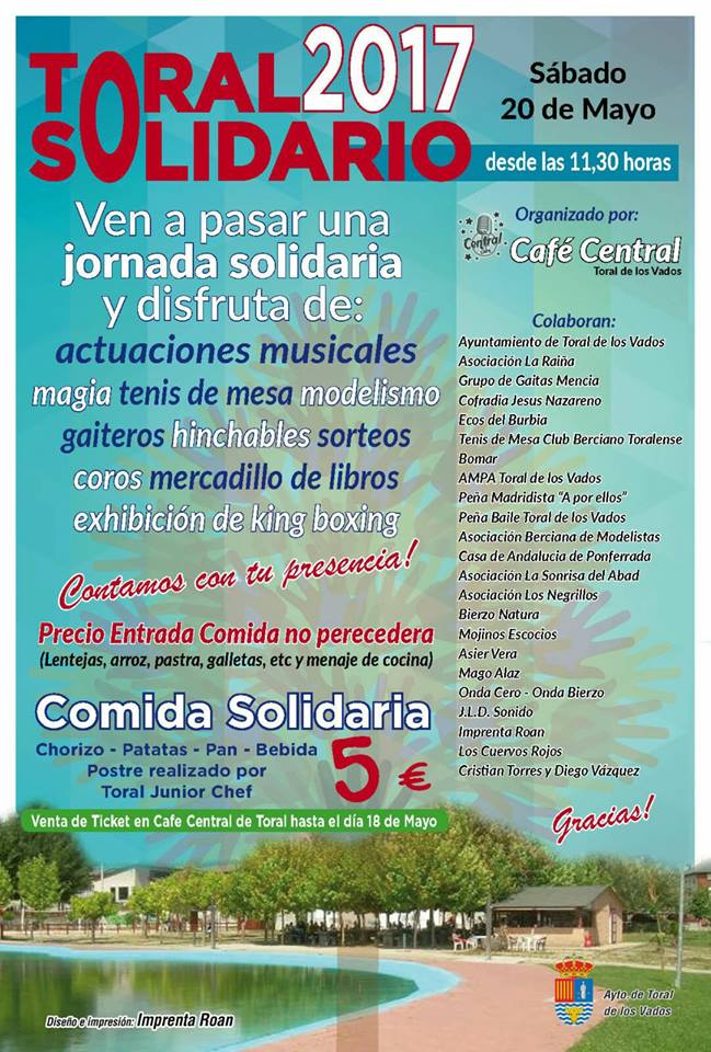 El próximo sábado 20 de mayo en la Playa Fluvial de Toral de los Vados, tendrá lugar TORAL SOLIDARIO 2017, que organiza el Café Central en colaboración con el Ayuntamiento de Toral de los Vados y diversas Asociaciones, empresas, grupos y personas particulares.