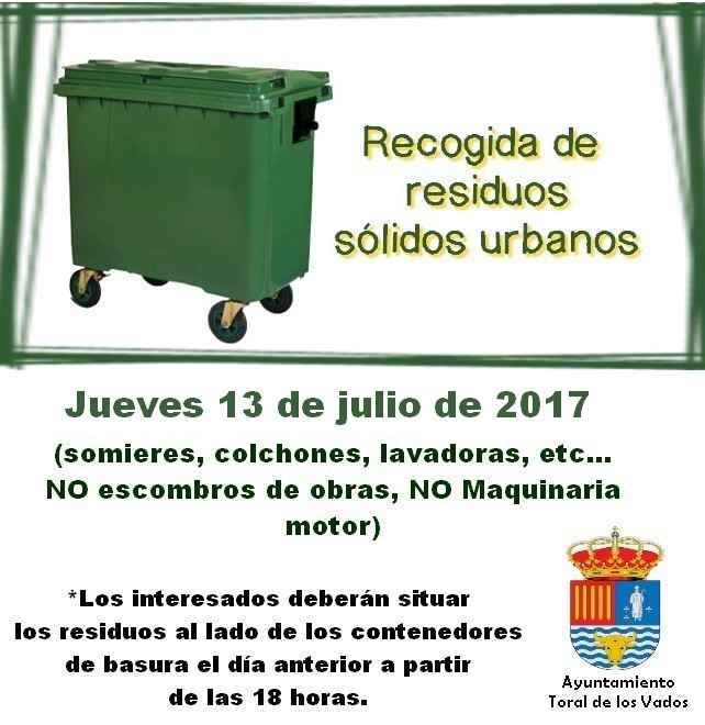 QUE LA MANCOMUNIDAD DE MUNICIPIOS BIERZO CENTRAL PROCEDERÁ A LA RECOGIDA DE RESIDUOS SOLIDOS URBANOS (Somieres, colchones, lavadoras, etc .... NO Escombros Obras, NO Maquinaria Motor) EN LOS NUCLEOS DEL MUNICIPIO DE TORAL DE LOS VADOS EL JUEVES 13 JULIO DE 2017.