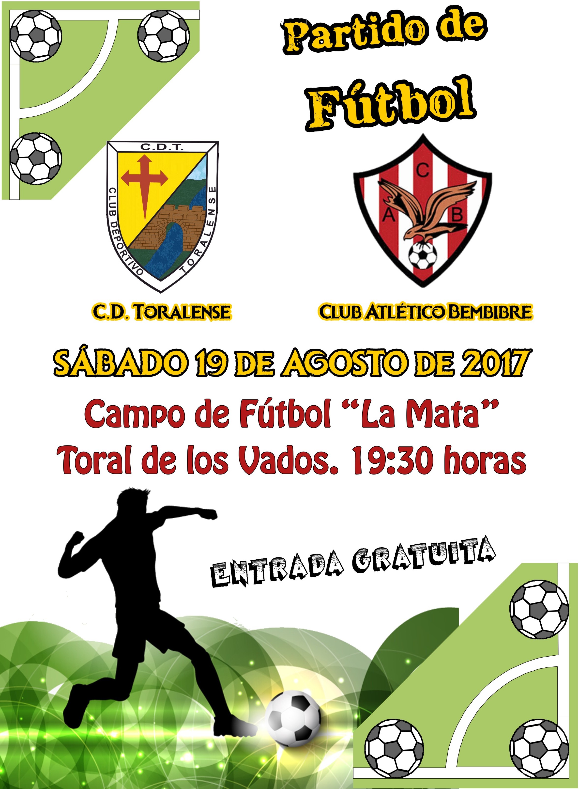 El próximo sábado 19 de Agosto, en el Campo de Fútbol “La Mata” de Toral de los Vados a las 19:30 h, el Club Deportivo Toralense se medirá al Club Atlético Bembibre en partido amistoso. La entrada es gratuita. ¡AUPA TORALENSE!