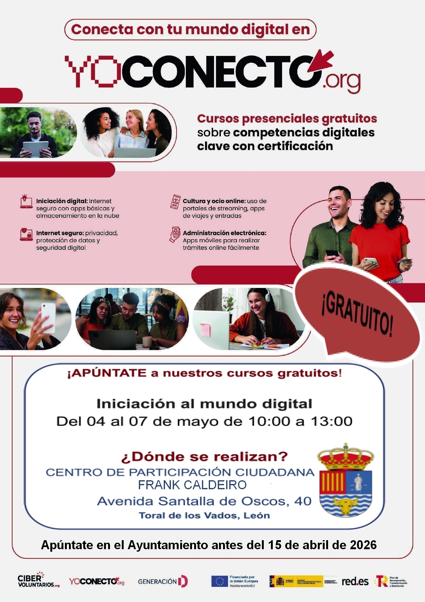 Las personas interesadas en asistir a este curso gratuito deben inscribirse en el Ayuntamiento. La fecha límite para realizar la inscripción es el 15 de abril de 2026.