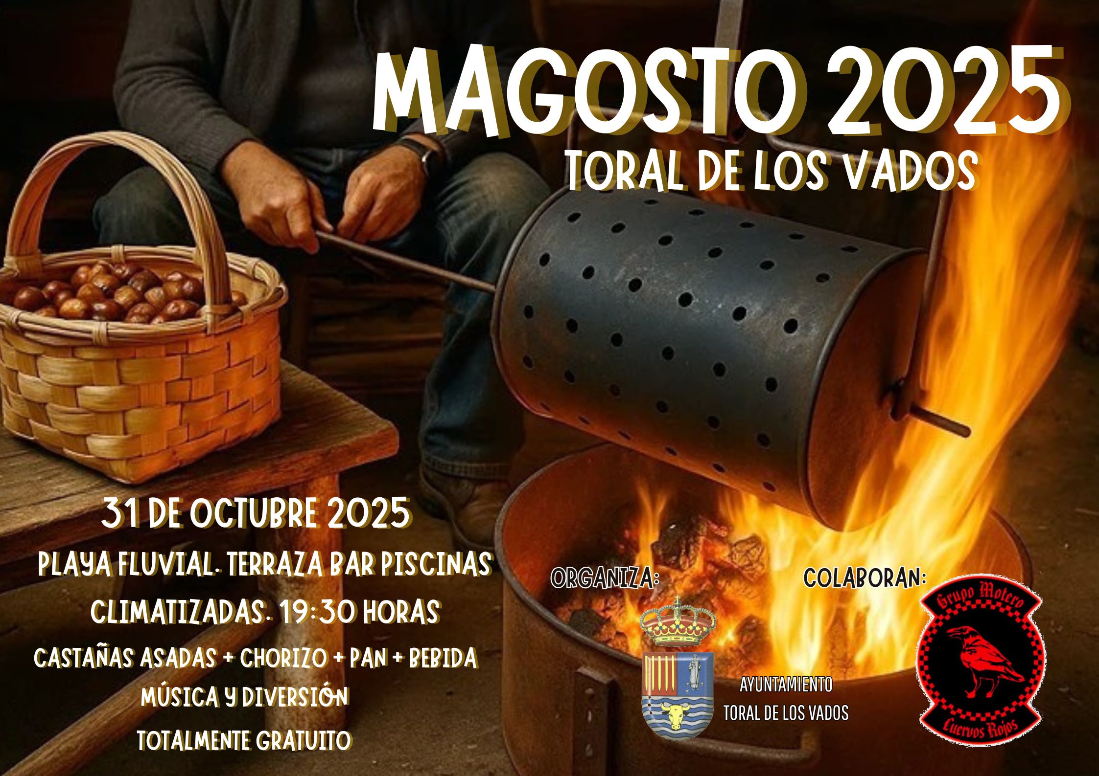 El Ayuntamiento de Toral de los Vados, en colaboración con la Agrupación motera Cuervos Rojos, informa que el Magosto Popular 2025 cambia de ubicación por razones climatológicas.La celebración tendrá lugar el próximo 31 de octubre a partir de las 19:30 horas en la terraza cubierta del bar de las piscinas climatizadas, en la Playa Fluvial.Los asistentes podrán disfrutar de un delicioso menú gratuito (hasta agotar existencias) compuesto por Castañas + chorizo cocido + pan + agua o vino.Y después del magosto… ¡música y diversión asegurada para todos los asistentes!¡No faltes! Te esperamos para compartir esta fiesta tradicional en un entorno resguardado de la lluvia....