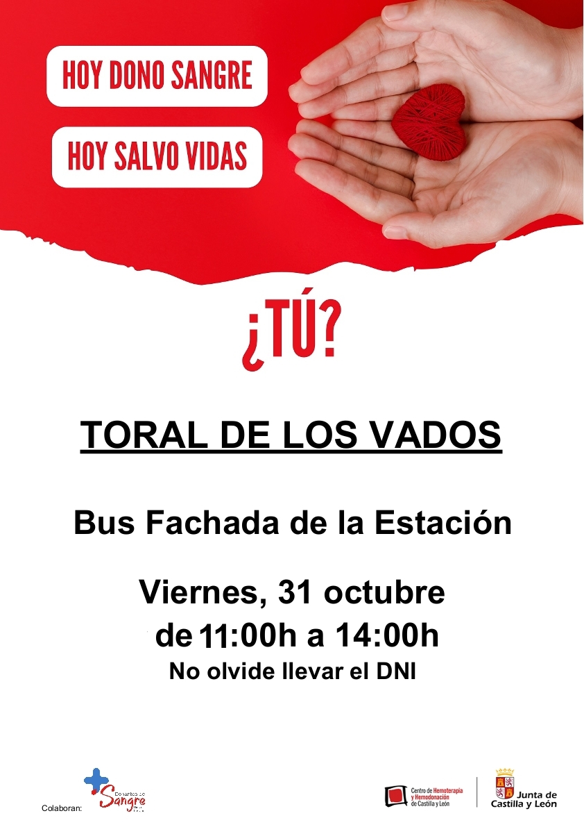 El centro de Hemoterapia y Hemodonación de Castilla y León informa que el próximo VIERNES 31 DE OCTUBRE de 2025, entre las 11:00 y las 14:00 horas, estará aparcado su autobús en la plaza de la estación para que todas aquellas personas que lo deseen puedan donar sangre. No olvidar llevar el DNI.!YA QUE ESTAMOS DONAMOS!...
