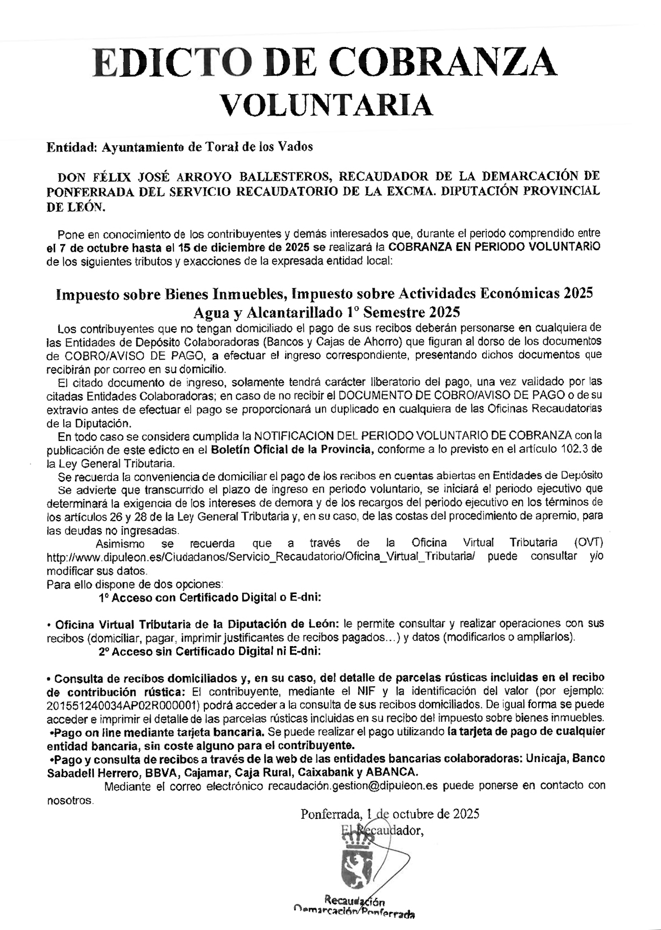 Pone en conocimiento de los contribuyentes y demás interesados que, durante el periodo comprendido entre el 7 de octubre hasta el 15 de diciembre de 2025 se realizará la COBRANZA EN PERIODO VOLUNTARIO de los siguientes tributos y exacciones de la expresada entidad local: