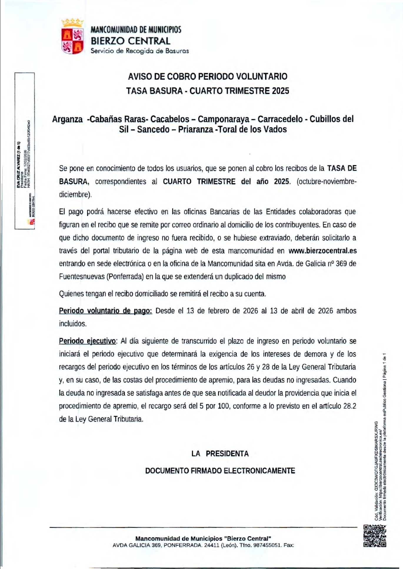 Se informa que la Mancomunidad de Municipios "Bierzo Central" ha abierto el periodo de pago para la tasa de basura correspondiente al cuarto trimestre de 2025 (meses de octubre, noviembre y diciembre).