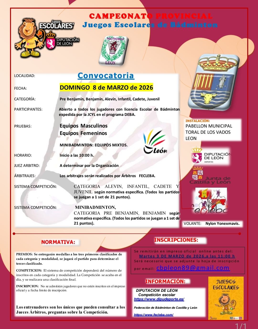 El Pabellón Municipal de Toral de los Vados será escenario del Campeonato Provincial de Juegos Escolares de Bádminton, organizado dentro del programa de Juegos Escolares impulsado por la Diputación de León y la Junta de Castilla y León.